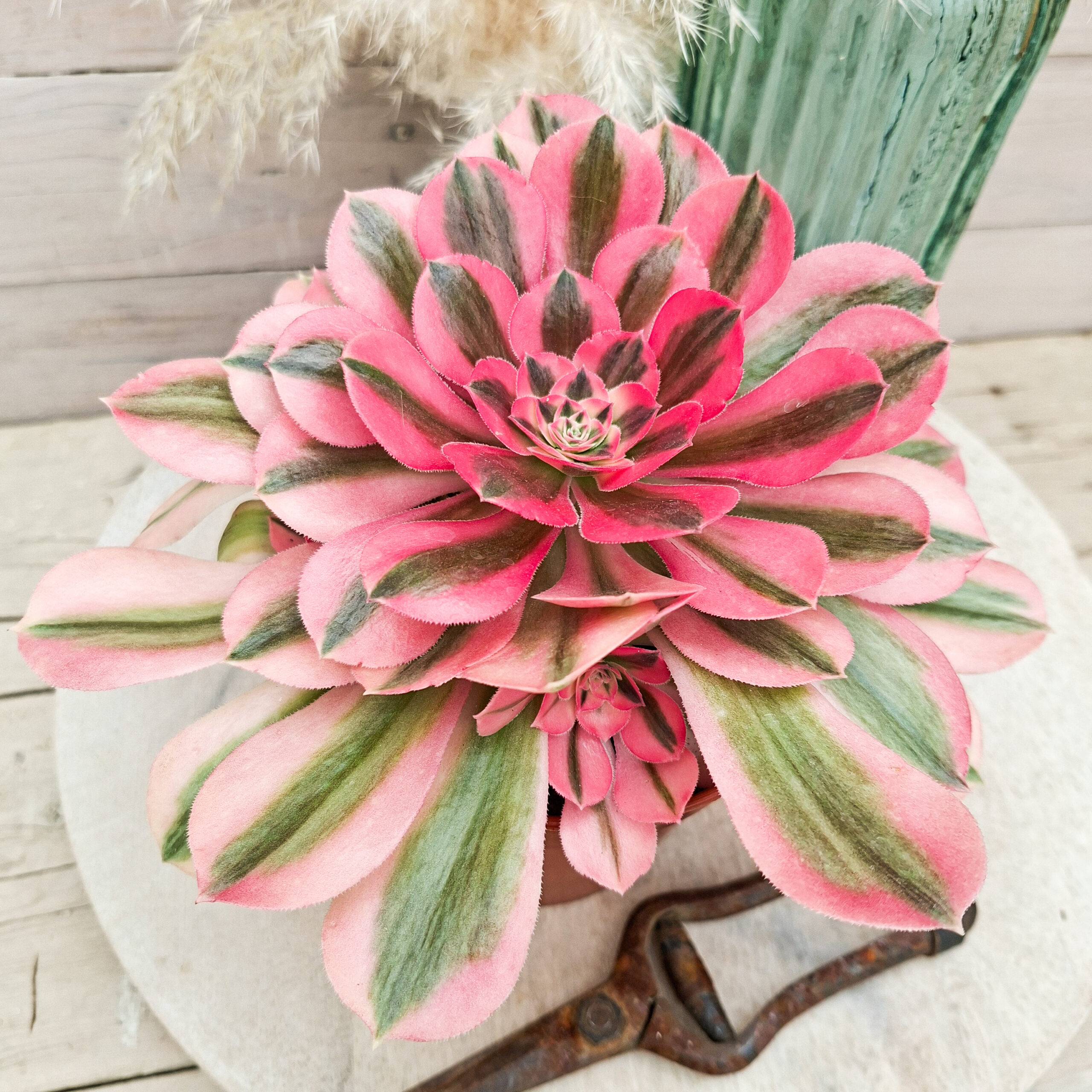 L’Aeonium ‘Peacock’ développe une grande rosette élégante qui ramifie assez facilement, portée par des tiges qui s’allongent progressivement pour former un buisson d’une cinquantaine de centimètres de haut. Ses feuilles, longues et fines mêlent vert tendre, crème et des nuances rosées lorsque la lumière est généreuse, offrant un contraste vif qui lui donne son allure de plume irisée.’ Tout comme l’Aeonium ‘Firecracker’ il est particulièrement sensible aux périodes chaudes et se recroqueville complètement en période estivale.